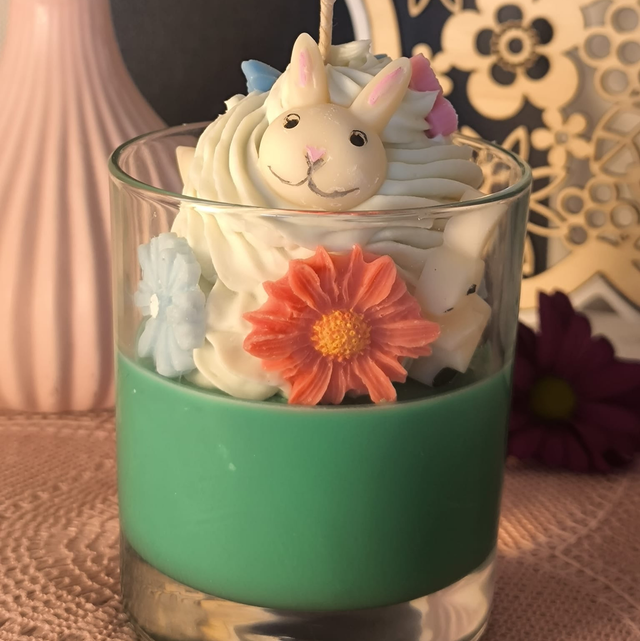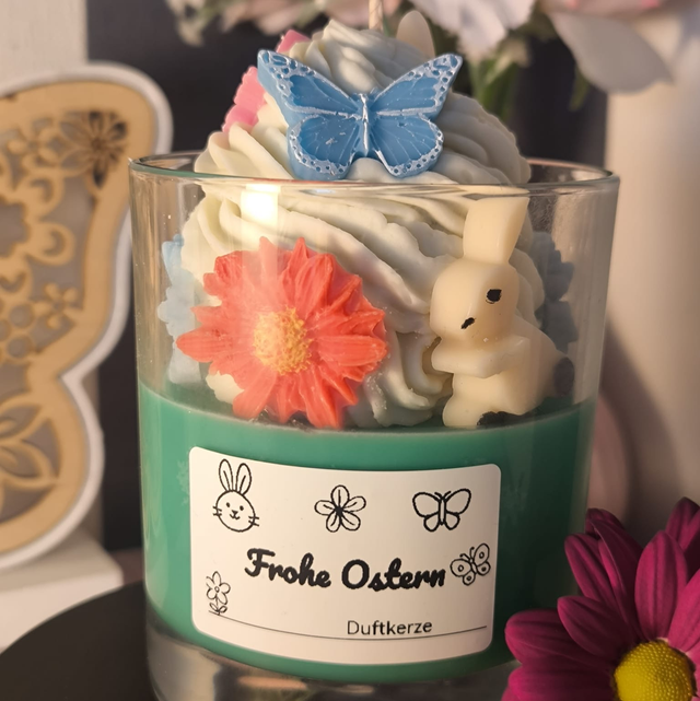 Stilvolle Kerze in passendem Frühlingsdesign mit frischem Blumenduft.